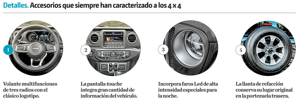 El interior no pierde la esencia del 4x4, sin embargo sí cuenta con mucha tecnología y amenidades. Dependiendo la versión, integra pantallas de 7 u 8.4” con Uconnect, y varios puertos USB, cuadro de instrumentos que monitorea constantemente al vehículo y una muy buena calidad en cuanto a acabados; algo que me agradó mucho es el campo de visión que ofrece, gracias a su altura y diseño, además de tener todo a la mano, y desmontar las piezas del techo resulta muy sencillo.