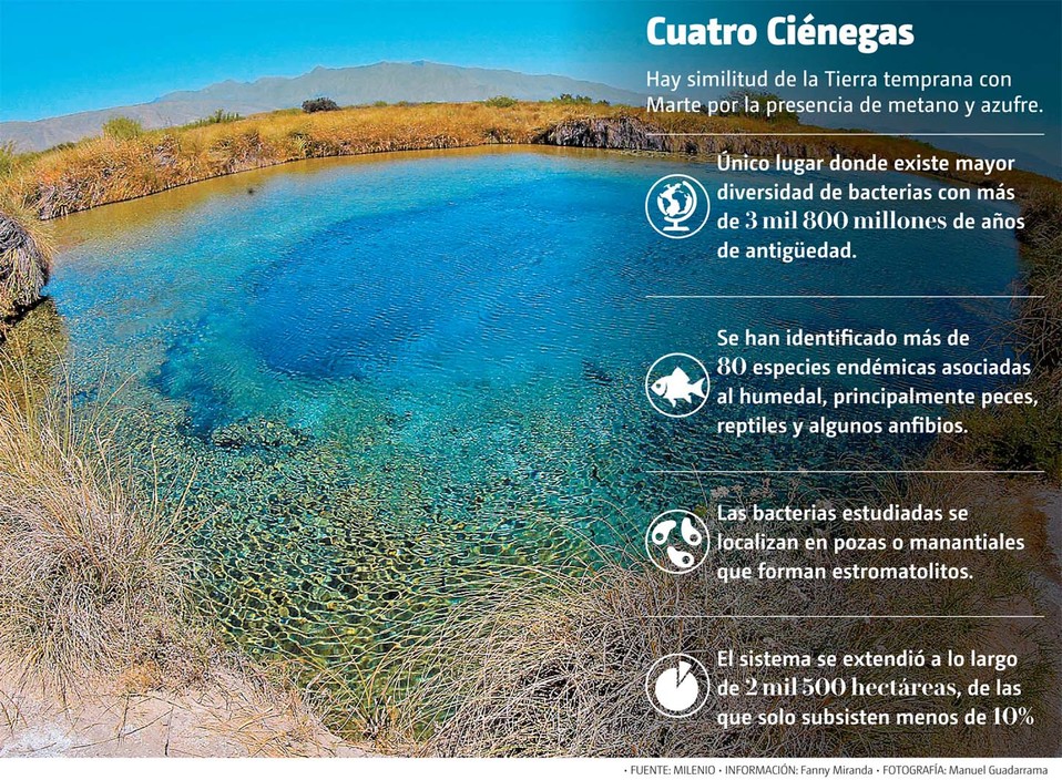 Las pozas de Cuatro Ciénegas, Coahuila, son el único lugar del planeta donde habita la mayor diversidad de bacterias de más de 3 mil 800 millones de años de antigüedad, la clave para entender cómo surgió la vida en la Tierra y así comprender la evolución en Marte, pues se trata del lugar más parecido a ese planeta, señaló la doctora Valeria Souza, del Instituto de Ecología de la UNAM.
