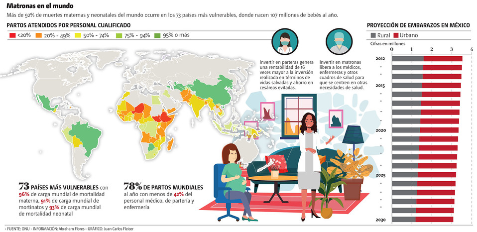 En México, el IMSS cuenta con al menos 7 mil parteras que atienden principalmente en comunidades rurales, de manera particular en Chiapas, Veracruz, Puebla, Hidalgo y Oaxaca, aunque también existe un directorio nacional de parteras tradicionales distribuidas en al menos 24 estados.
