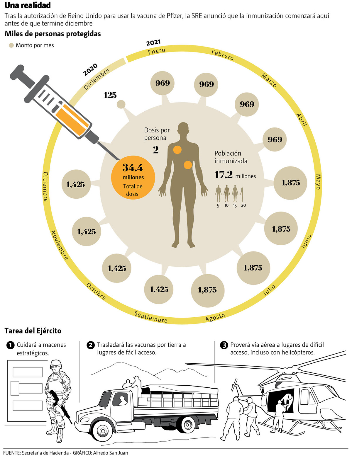 Por la mañana, en Palacio Nacional, el presidente López Obrador informó que la Secretaría de Salud tiene ya listo el plan de vacunación y que dispone de 20 mil millones de pesos para comprar las primeras dosis a Pfizer.