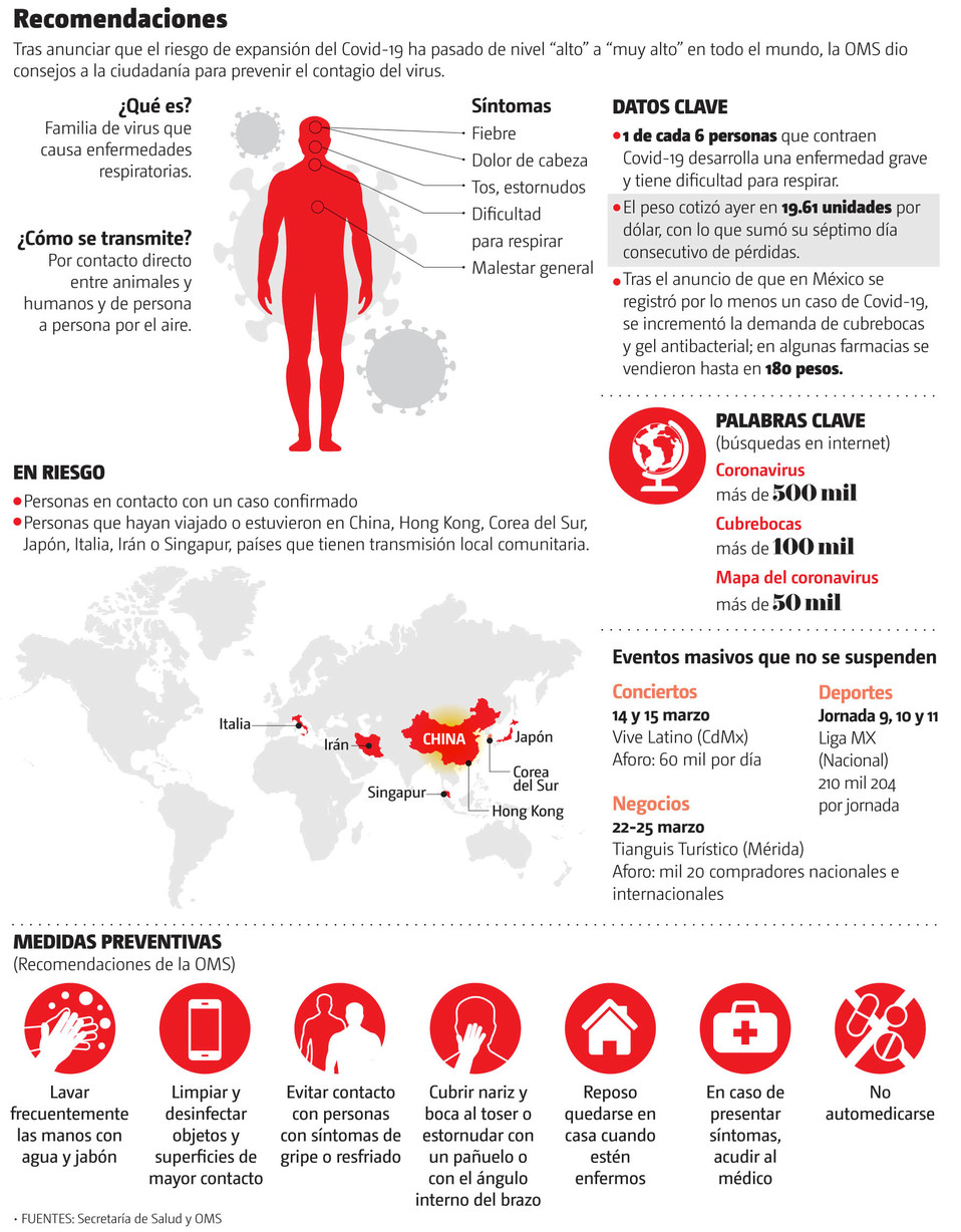 El gobierno federal descartó emitir una emergencia nacional o cancelar eventos masivos luego de confirmar la llegada del Covid-19 a México con tres infectados y tres casos sospechosos hasta el momento.