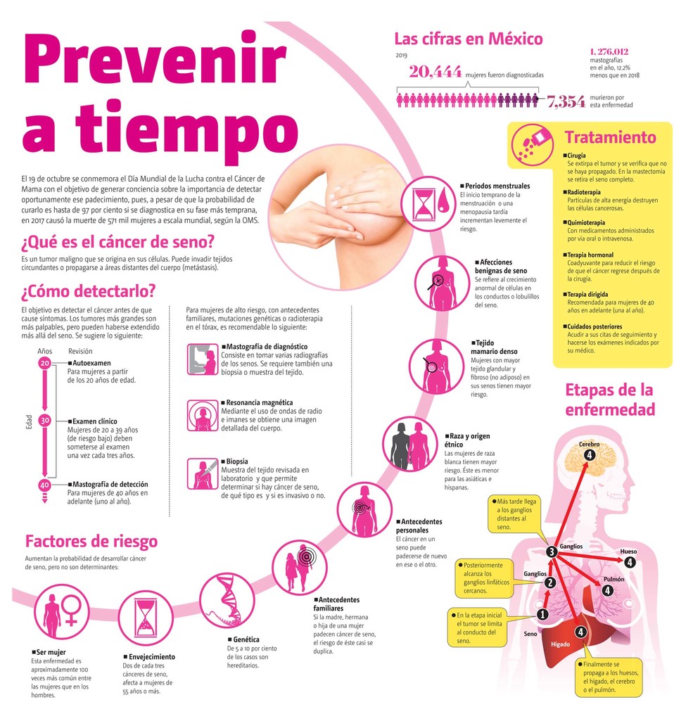En lo que va de 2019 se han registrado 7 mil 354 defunciones por cáncer de mama, la cifra más elevada en la historia del país y que representa un aumento de 19.6 por ciento en la tasa de mortalidad con respecto a 2018, debido a que se hicieron menos estudios de detección a través de mastografías en clínicas, servicios y caravanas de la salud a zonas marginadas.