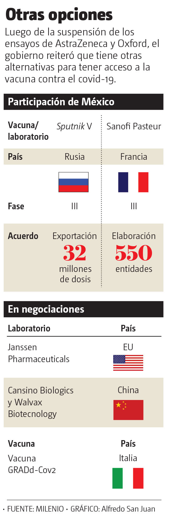 Tras el anuncio del laboratorio AstraZeneca de suspender los ensayos, el presidente Andrés Manuel López Obrador aseguró que México tiene otras opciones para obtenerla de manera prioritaria en los gobiernos de Rusia, China y EU.