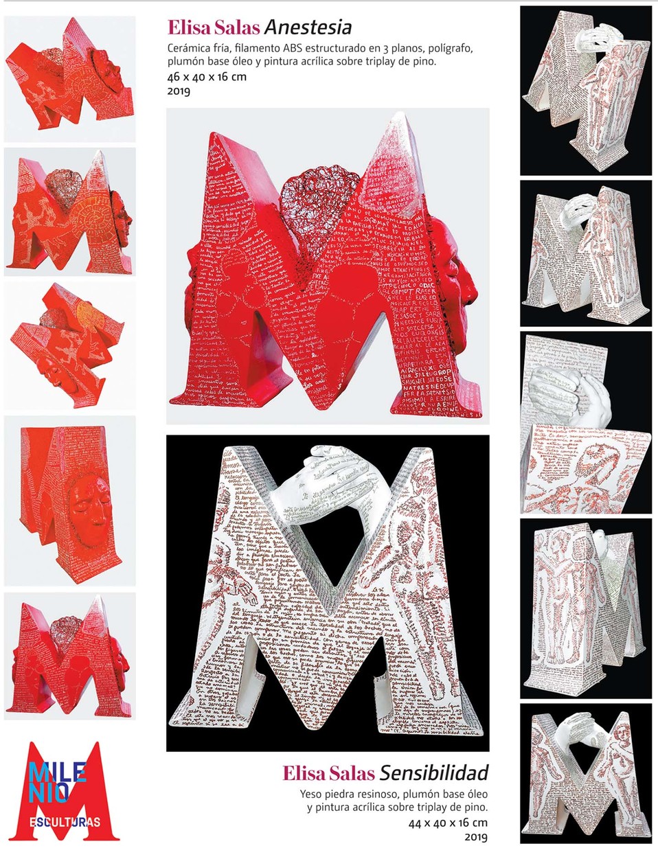 Me basé en un ensayo sobre la comunicación que trataba de plasmar antagónicos. De un lado la sensibilidad y del otro la anestesia. En la sensibilidad partimos de la sombra de dos manos que representan la sincronía de la comunicación y cómo el lenguaje va existiendo y así se va desarrollando todo el ensayo, y plasmé a las Tres Gracias detrás y adelante. La técnica es un dibujo achurado en el cual sustituyo cada línea con las palabras del ensayo. Lo hice así porque las Tres Gracias representan a la poesía, a la armonía y a la gracia, y en el opuesto, en el espejo, tenemos la anestesia, que es la insensibilidad, porque finalmente es la incapacidad de empatía.