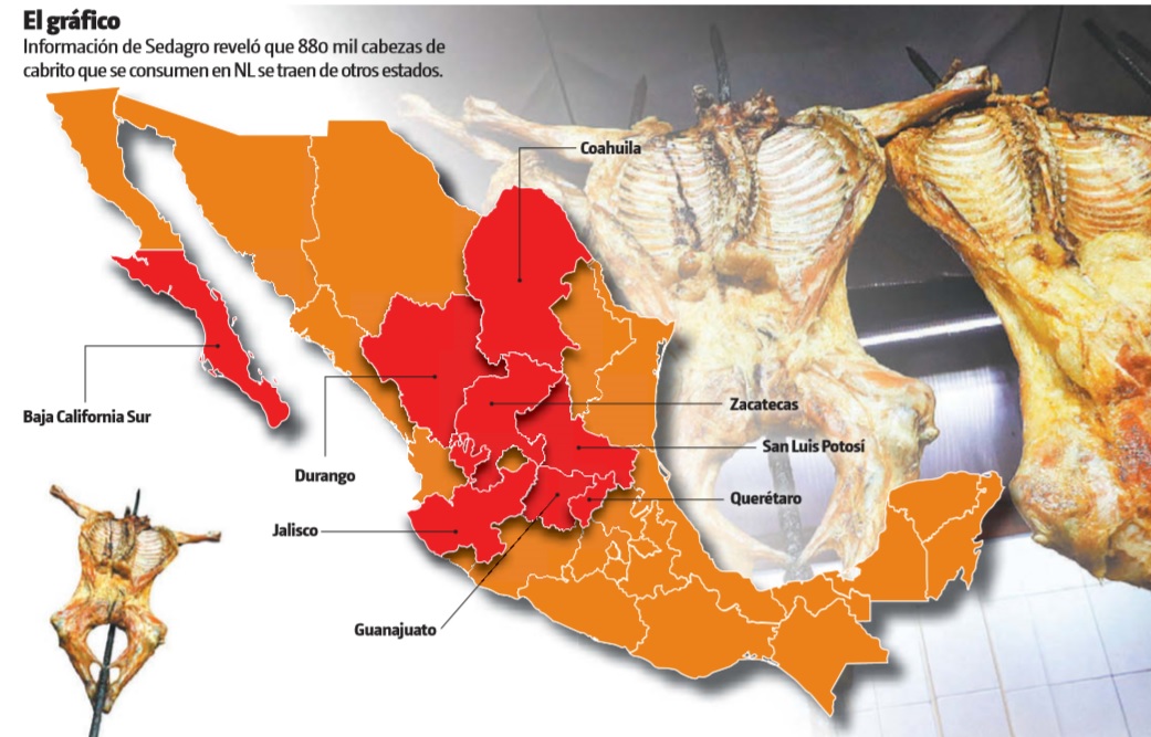 Fernández explicó que en los registros de la dependencia se calcula que 880 mil cabezas de cabrito que se consumen anualmente en Nuevo León se traen de otros estados, principalmente de Coahuila, San Luis Potosí, Zacatecas, Baja California Sur, Durango, Guanajuato, Querétaro y Jalisco.