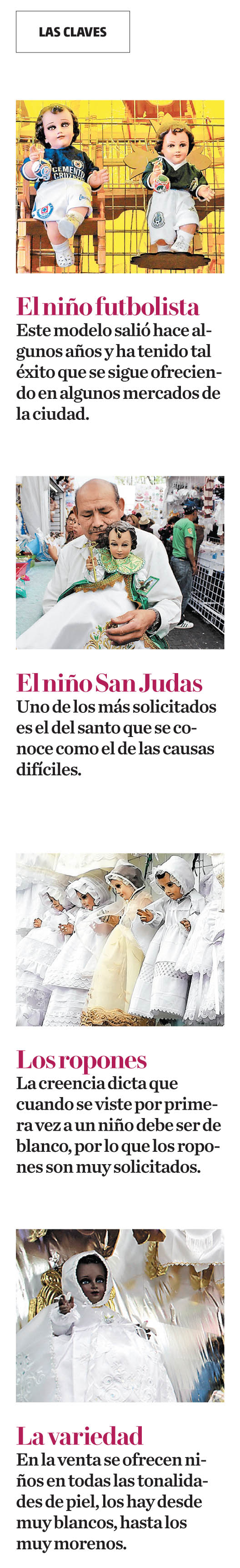 Niño del Sagrado Corazón de Jesús, Niño de las Palomas, Niño de la Misericordia, Niño Estudiante, Niño de la Salud se lee en algunas de las imágenes que lucen atuendos creados en texturas de terciopelo, encaje, satín y algodón, y se complementan con accesorios “idénticos a los santos porque la idea es que se lo lleve igualito al Santo que piden”, dice Ernesto López, uno de los locatarios que asegura que la venta ha estado “buena, pero esperemos que mejore mañana (hoy sábado), pues ya el domingo, que es el mero día, solo nos dan chance de ponernos un rato en la mañana. Y lo que se vendió se vendió”.