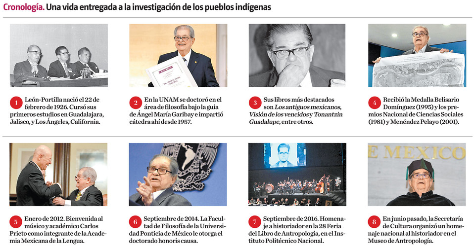 El filósofo, historiador, humanista y lingüista Miguel León-Portilla (México, 1926-2019), cuyo sueño eterno será que los pueblos indígenas —sus lenguas y culturas— sean valorados y reconocidos en su justa dimensión, falleció ayer de 93 años.