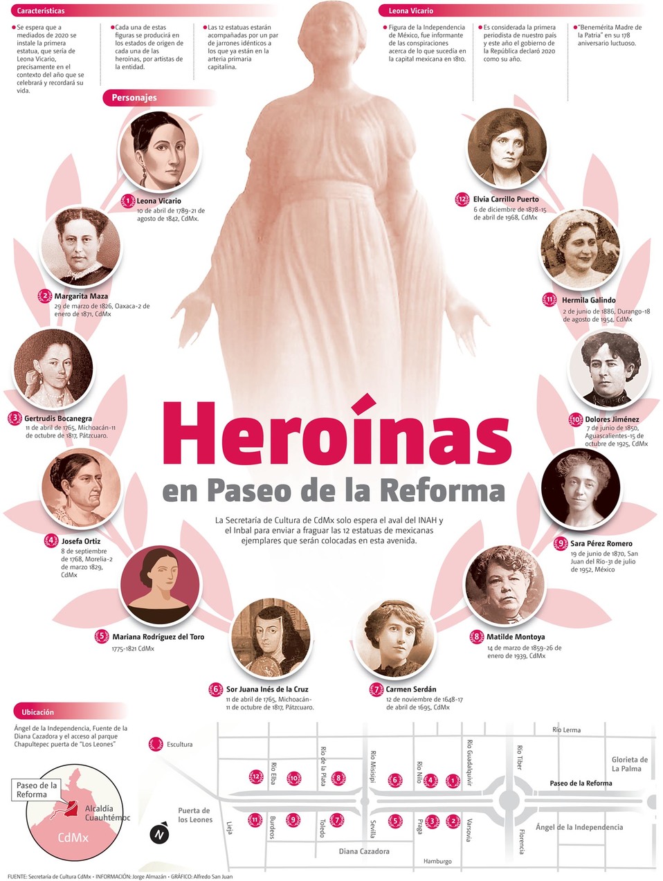 La Secretaría de Cultura de Ciudad de México solo espera el aval del Instituto Nacional de Antropología e Historia (INAH) y del Instituto Nacional de Bellas Artes y Literatura (INBAL) para mandar hacer 12 estatuas de mujeres ejemplares que serán colocadas sobre Paseo de la Reforma.