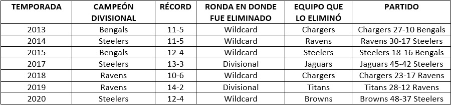 Una de las divisiones más competidas de toda la NFL es el Norte de la AFC. Sin embargo, desde hace algunas temporadas, su monarca ha quedado corto en los playoffs. En esta ocasión, los Steelers, a manos de los Browns -rivales del sector-, cayeron en la ronda de Wildcard.