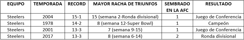 Tras su victoria ante Dallas, misma que les permitió implantar el récord de 8-0, la escuadra comandada por Mike Tomlin bien pudiera soñar con la proeza de culminar la temporada de manera invicta, cuestión que les permitiría superar a los Steelers del 2004, conjunto que atañe la mejor marca en la historia de la franquicia (15-1), además de igualar a los Patriots del 2007.
