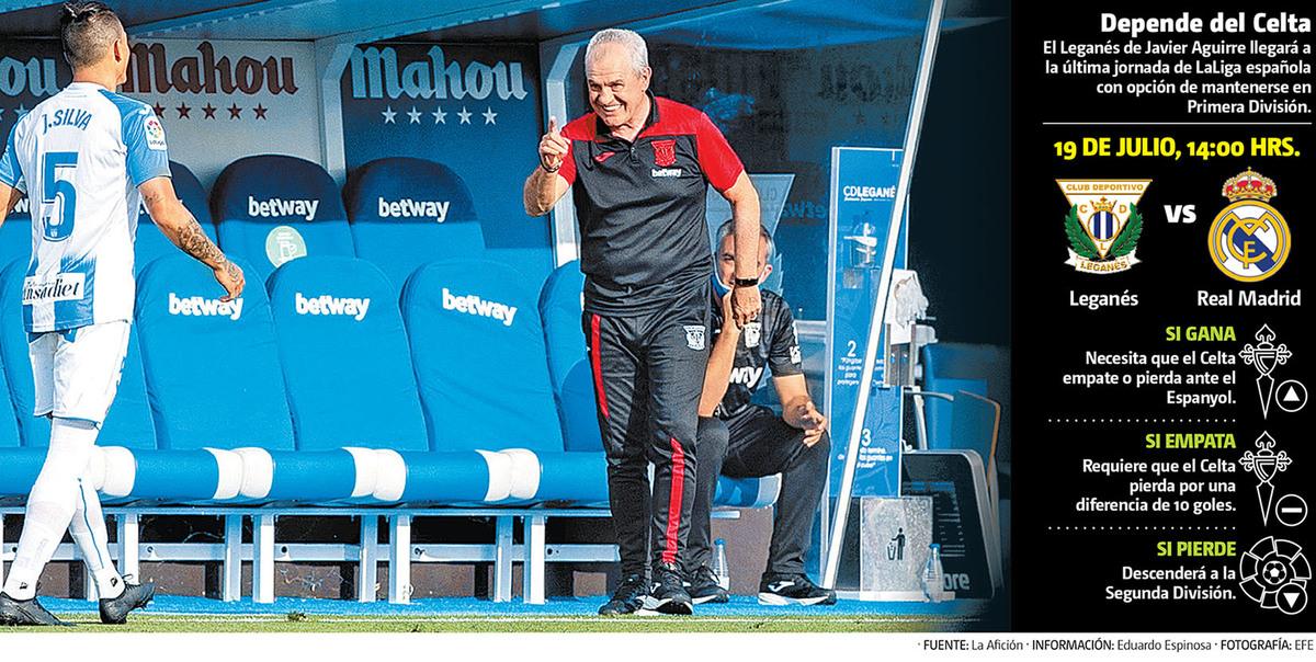El domingo, el conjunto de Aguirre necesita vencer sí o sí al Real Madrid y esperar que el Celta empate o pierda en su juego frente al ya descendido Espanyol de Barcelona para salvar la categoría. Si el Leganés empata, deberá rezar por una goleada monumental de los Periquillos –por 10 goles de diferencia– sobre el Celta, pero si cae ante el recién proclamado campeón de España, el descenso será inevitable.