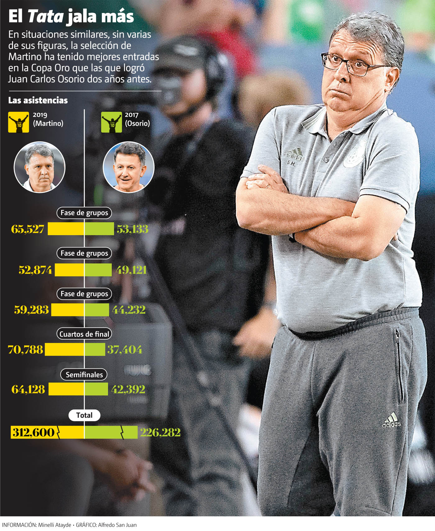En los resultados, el Tricolor de Martino ya superó lo hecho por el de Osorio que quedó en Semifinales, mientras que el actual buscará su octavo título el domingo frente a Estados Unidos. En la taquilla, hasta el momento, la selección mexicana ha metido 312 mil 600 seguidores a sus cinco partidos, casi 100 mil más que en la edición anterior del 2017 en la que atrajo 226 mil 282.