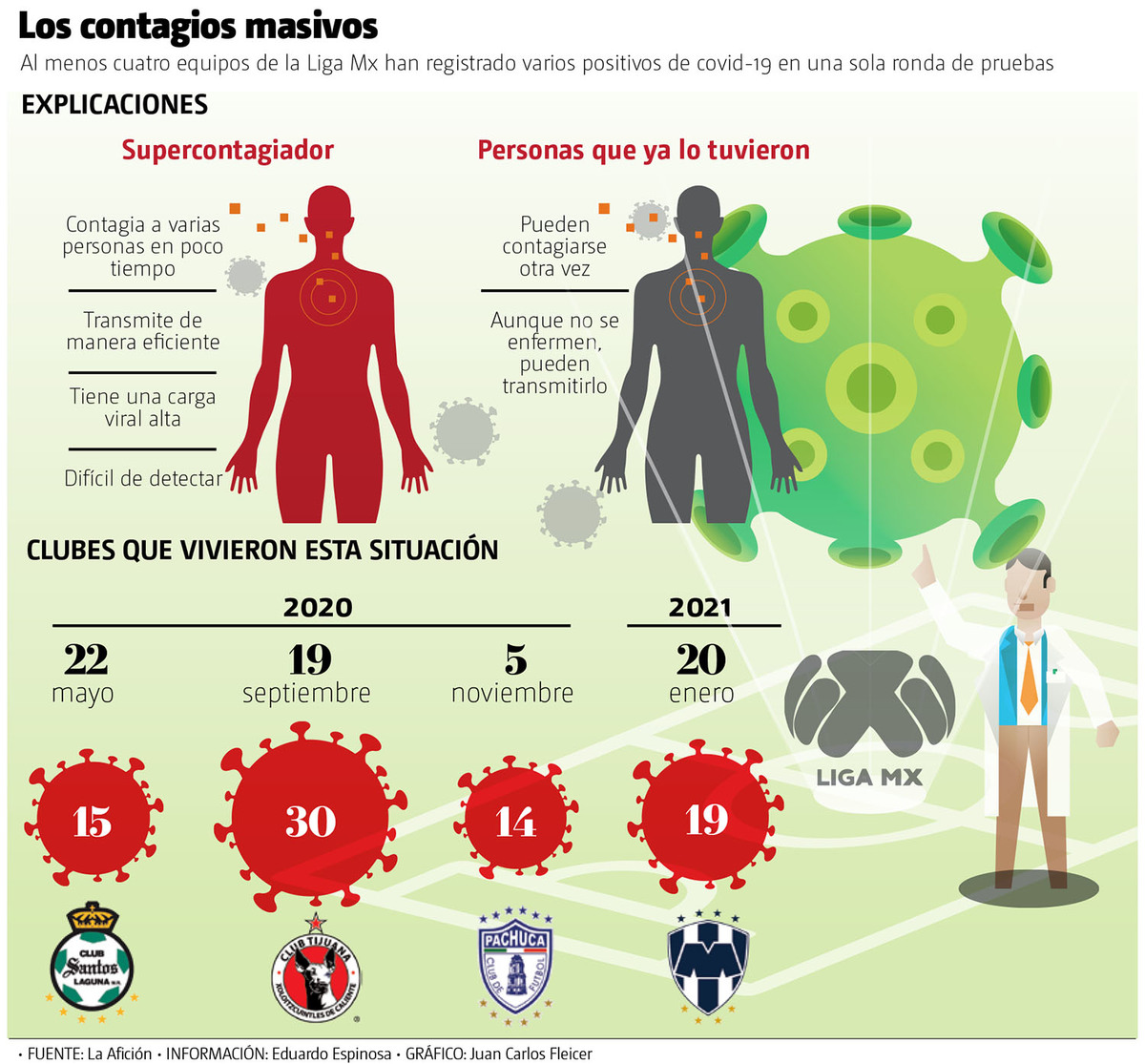 En esta semana se volvió a presentar un brote masivo en la Liga MX. Monterrey acumuló 19 personas contagiadas en solo cinco días. Este fenómeno también se dio el semestre pasado, cuando algunos equipos reportaron varios casos al mismo tiempo, el más grave -hasta el momento- han sido los 30 positivos en Tijuana del 19 de septiembre.