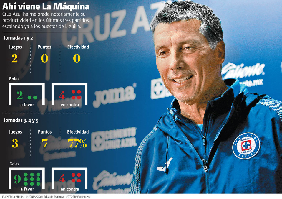 Sí, porque justo ahora se habla más del Cruz Azul goleador que ha metido nueve tantos en sus últimos tres compromisos (tres por partido) y ha sumado siete de sus últimos nueve puntos -y pudieron ser los nueve de no ser por la pifia de Corona ante Toluca-; en fin, La Máquina está a la alza y empieza a generar expectativas sobre sus alcances.