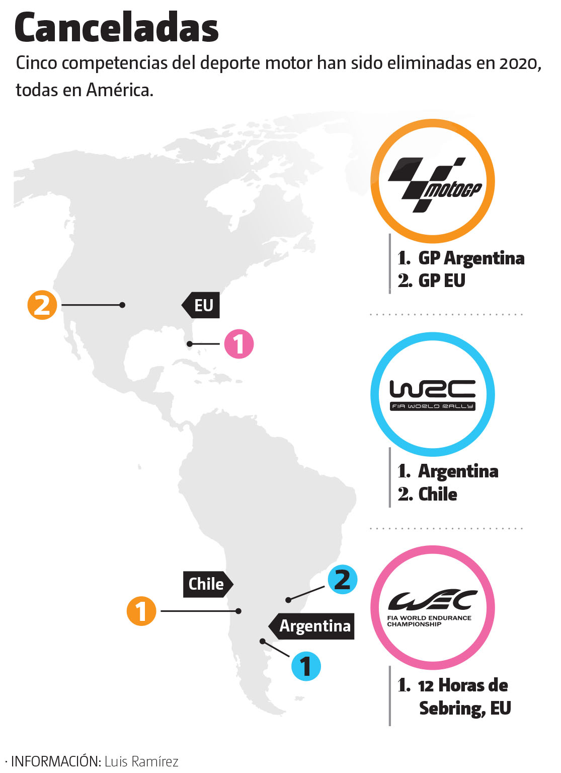 Es por eso que la decisión que el miércoles tomaron el Circuito de Las Américas en EU y MotoGP, de no celebrar la edición 2020 pactada para el 15 de noviembre, debe tomarse como una advertencia para la máxima categoría del automovilismo que, hasta ahora, no ha decidido qué hacer con sus cuatro fechas en esta zona del mundo (Canadá, EU, México y Brasil).