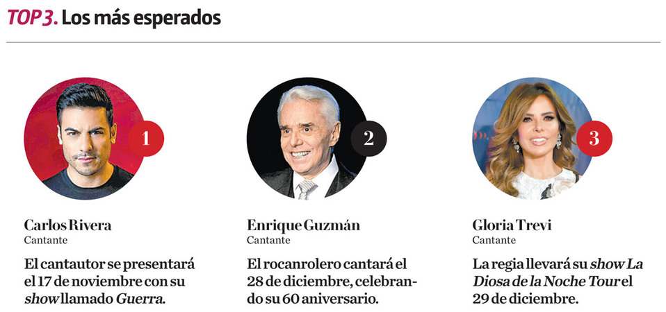 El 22 noviembre se presentará Alejandro Sanz y, en ese mismo mes, el comediante Franco Escamilla presentará su nuevo show el día 29. Mientras que el 30 de diciembre Lila Downs cerrará el programa anual con un concierto como parte de la promoción de su disco Al chile.