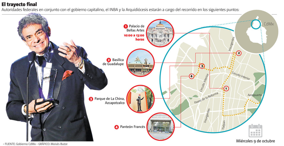 Las cenizas del Príncipe de la Canción llegarán al Aeropuerto Internacional de Ciudad de México, donde serán trasladadas hacia el Palacio de las Bellas Artes con la posible ruta de la calle Alberto Santos Dumont –Fuerza Aérea Mexicana– Circuito Interior–Viaducto– Eje Central Lázaro Cárdenas– Palacio de Bellas Artes.