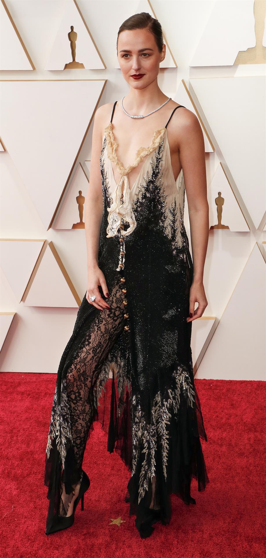 La actriz de 'La peor persona del mundo' luce atrevido look al estilo charlestón en los Oscar 2022.
