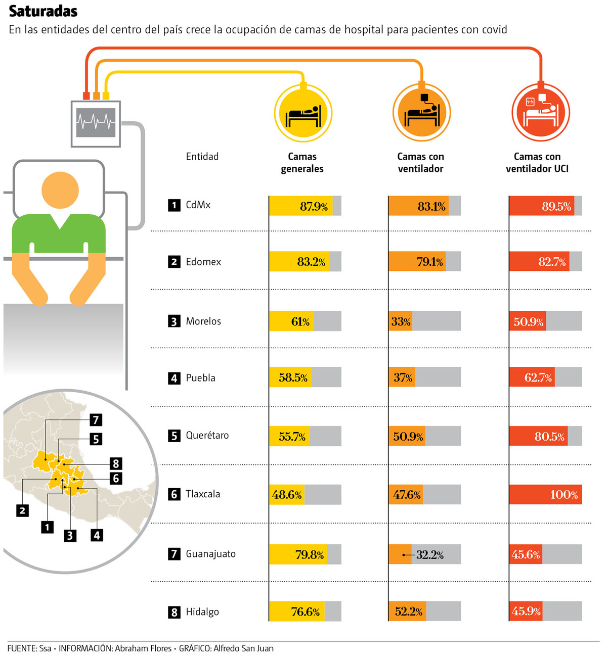 Ciudad de México vive una situación difícil, ya que 28 hospitales, de los 65 habilitados para atender la pandemia, tienen una ocupación de 100 por ciento en camas generales; 21, en camas con ventilador, y 23 en cuidados intensivos.