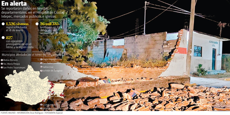 En Oaxaca se ha registrado una cadena intensa de sismos que provocaron daños en las regiones de la Costa y el Istmo de Tehuantepec; en lo que va de enero, en el país ocurrieron mil 526 y 827 tuvieron su epicentro en este estado, informó el titular de la Coordinación de Protección Civil estatal, Heliodoro Díaz.