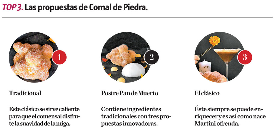 “Experiencia sensorial” es como el chef Othon Gayosso titula las opciones que ha creado para degustar en Comal de Piedra, donde se puede encontrar el tradicional maridaje que logra el pan de muerto con un chocolate oaxaqueño o bien un café de altura; pero también se puede saborear la propuesta que presenta al acompañar el pan de muerto con un Martini.