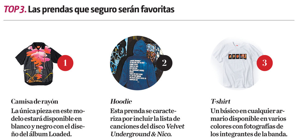 Además, la colección incluye una serie de camisetas ringer con fotografías de los cinco integrantes de la banda Lou Reed, John Cale, Nico, Sterling Morrison y Maureen Tucker.