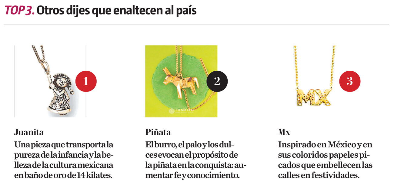 Los dijes de Juanita, inspirada en las icónicas muñecas de trapo bordadas, son otra opción; Piñata, uno de los principales símbolos de la tradicional fiesta mexicana, se encuentra poligonizado para darle un toque de contemporaneidad, y las piezas MX inspiradas en México, en los colores y diseños de papel picado.