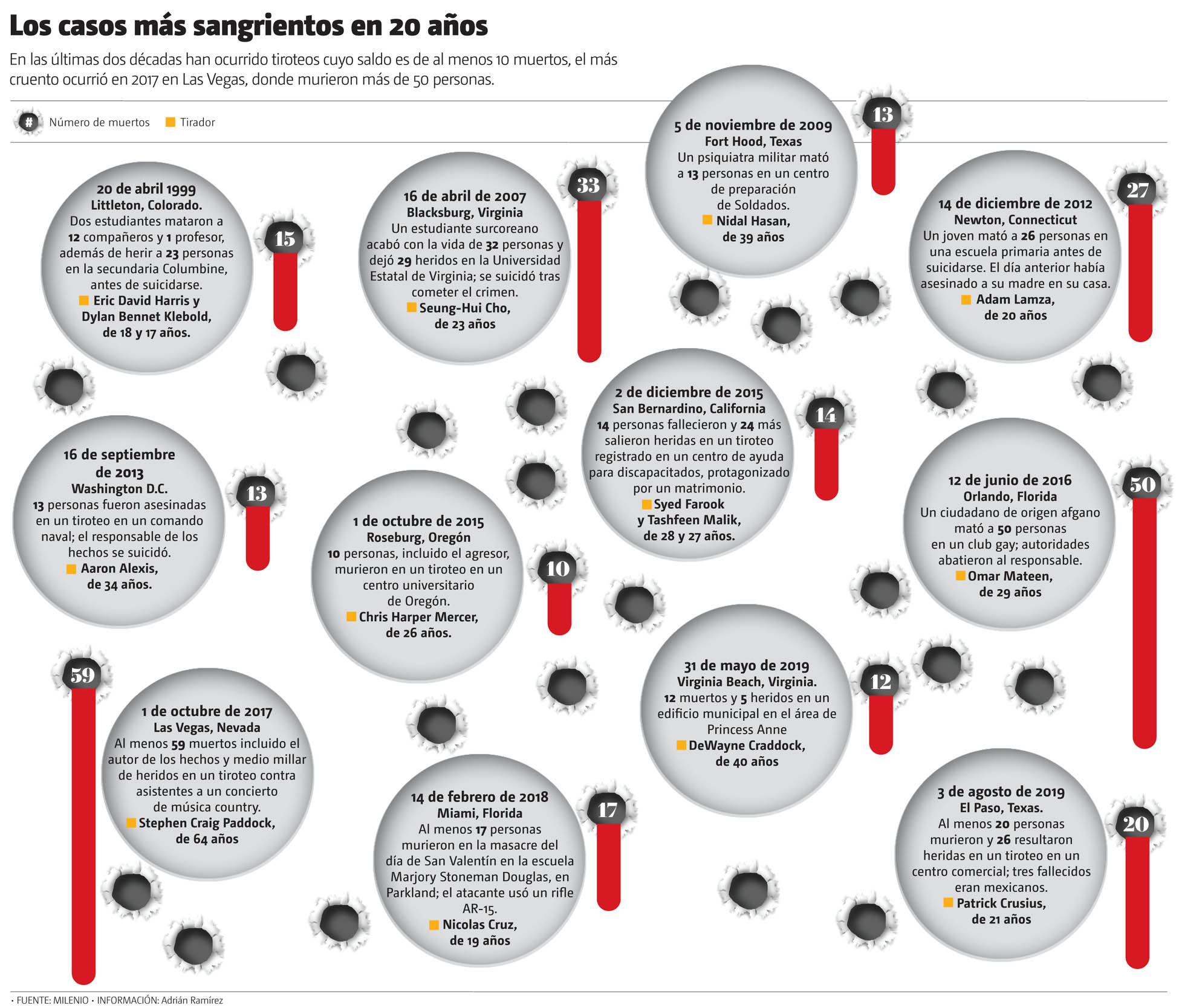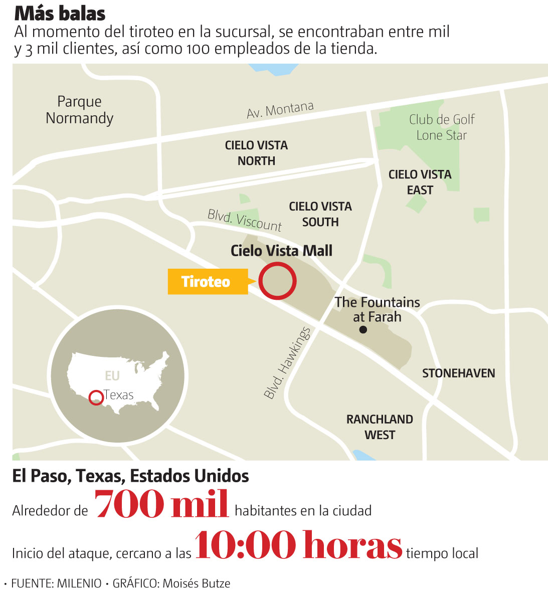El más reciente sucedió ayer, cuando un joven —con las orejas tapadas, una camisa negra y un pantalón de camuflaje— irrumpió en el Walmart del centro comercial Cielo Lindo y abrió fuego con un AK-47 contra los clientes, dejando 20 muertos y 26 heridos.