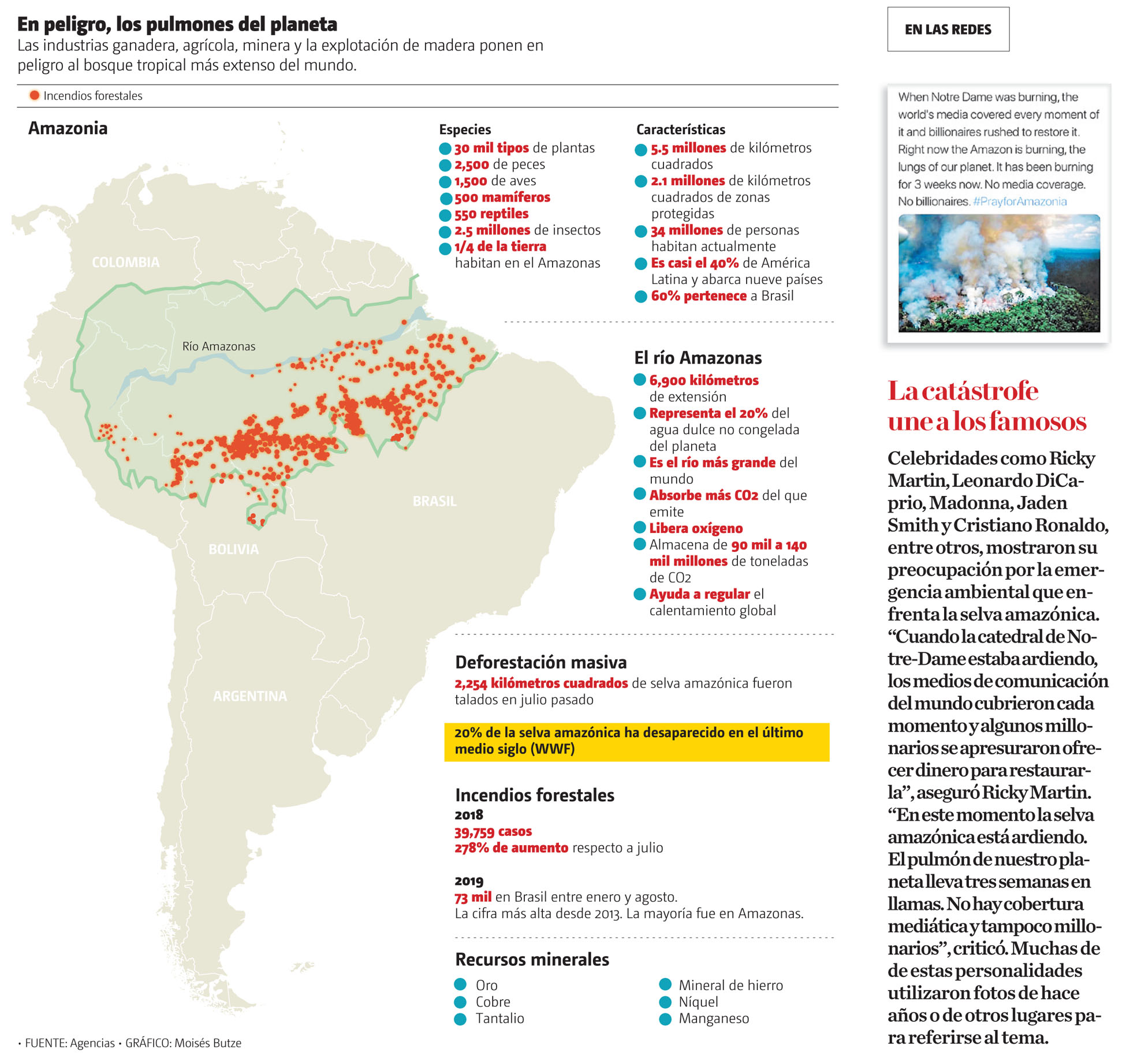 “Estoy profundamente preocupado por los incendios en la Amazonia. En medio de la crisis climática mundial, no podemos permitirnos más daño a una gran fuente de oxígeno y biodiversidad. La selva debe ser protegida”, tuiteó el secretario general de la ONU, António Guterres.