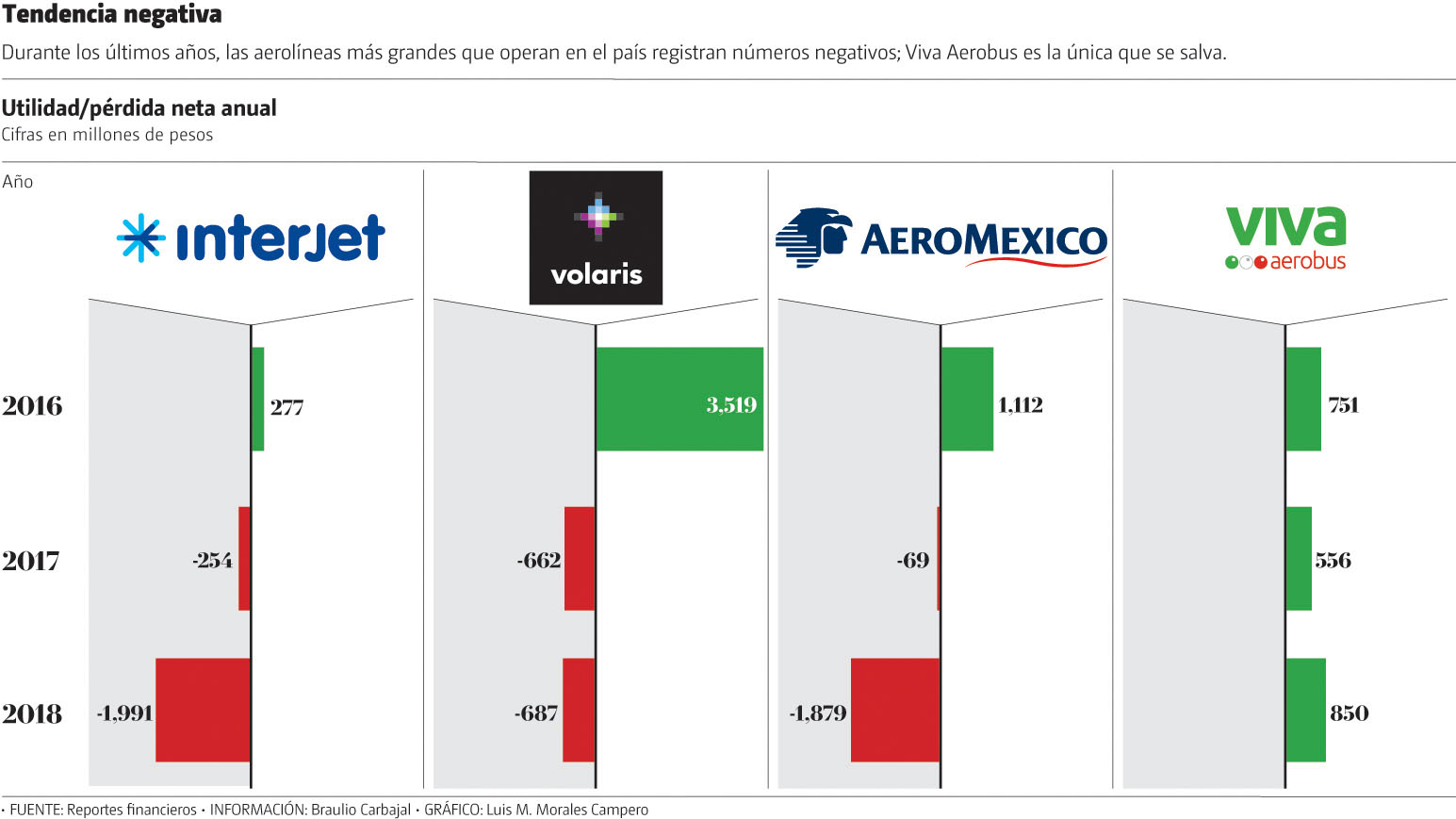 La única que se salva financieramente es Viva Aerobus, que en 2017 ganó 556 millones de pesos y en 2018 alrededor de 850 millones.