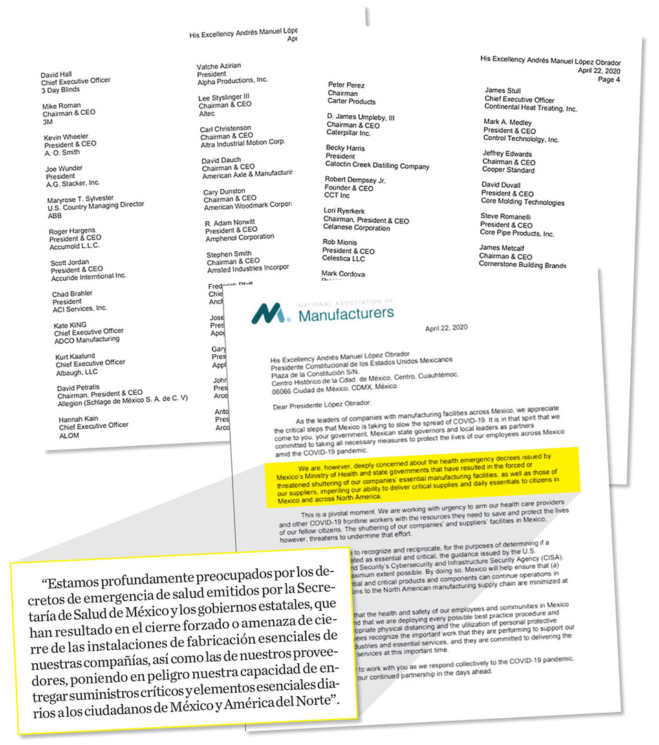 Las 327 empresas de manufactura firmantes, entre las que se encuentran proveedores de equipo médico, señalaron en la misiva: "Estamos profundamente preocupados por los decretos de emergencia de salud emitidos por la Secretaría de Salud de México y los gobiernos estatales, que han resultado en el cierre forzado o en amenaza para las instalaciones de fabricación esenciales de nuestras compañías, así como las de nuestros proveedores, poniendo en peligro nuestra capacidad de entregar suministros críticos y elementos esenciales diarios a los ciudadanos de México y América del Norte".