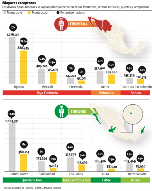 Desde el banco central las acciones se centrarán en mejorar los servicios financieros en puntos de entrada y primer contacto de canje de migrantes y turistas; ampliar la gama de servicios financieros y adecuarlos a las necesidades de migrantes y población que recibe moneda extranjera, y finalmente, robustecer y ampliar las relaciones de corresponsalías de bancos mexicanos con bancos corresponsales para repatriar los dólares.