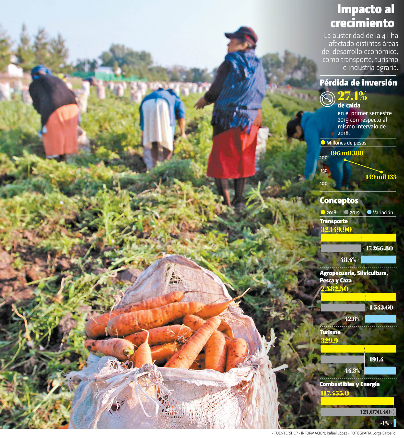 Otro de los rubros que detonan el desarrollo económico es la inversión en la industria agropecuaria, silvicultura, pesca y caza, pero la actual administración federal recortó el flujo de dinero para la compra de infraestructura o equipo 42.6 por ciento.