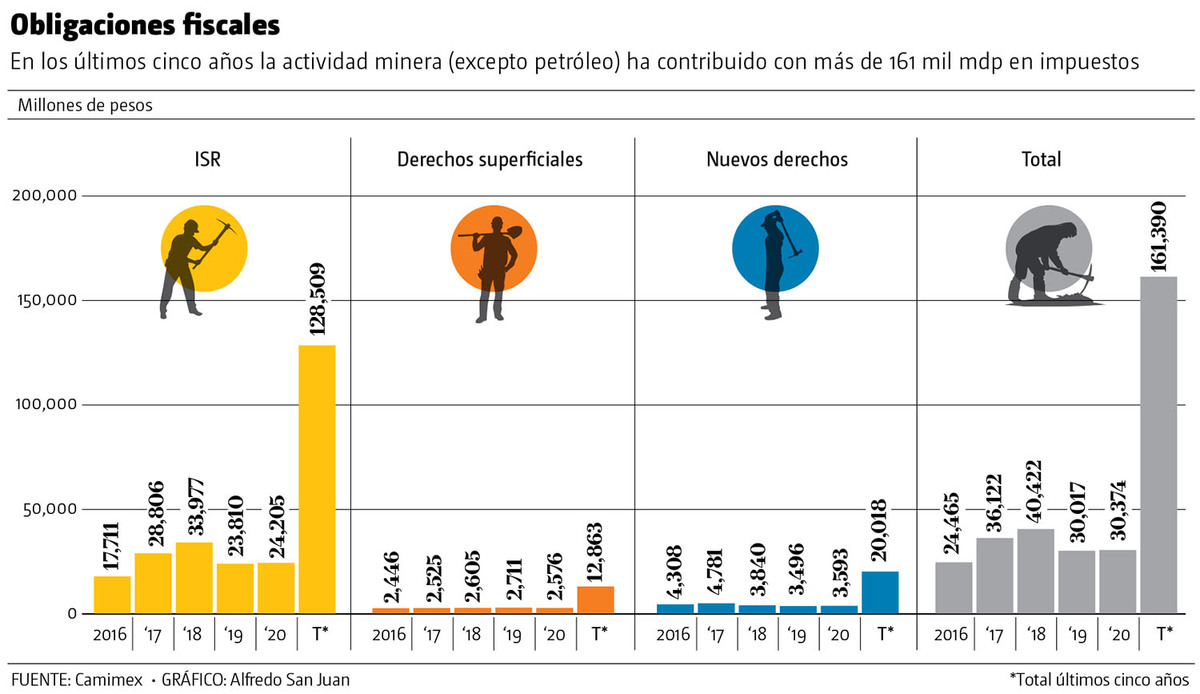 Aunque las cifras definitivas de 2020 del sector minero serán dadas a conocer en abril por parte de la Cámara Minera de México (Camimex), el organismo adelantó a MILENIO que en los últimos cinco años únicamente la actividad minera (excluyendo petróleo) ha contribuido con más de 161 mil millones de pesos en impuestos.