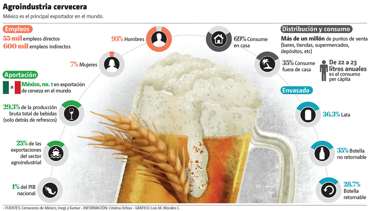 En 2019 el sector produjo 124.5 millones de hectolitros de cerveza, de los cuales 40 millones se exportaron a 180 países, consolidando a México como el mayor exportador de la bebida a escala mundial.
