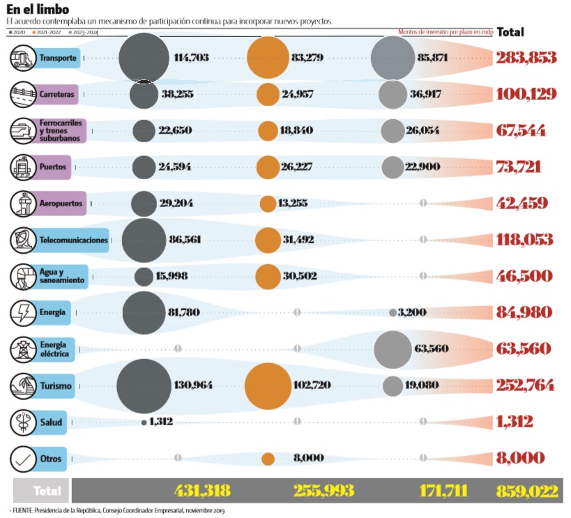 Retrasos en el diálogo con el gobierno federal y la pandemia del covid-19 frenaron el que hasta ahora sigue siendo uno de los pilares para el crecimiento económico de este sexenio. El 26 de noviembre de 2019, de la mano del sector privado, el presidente Andrés Manuel López Obrador presentó el Acuerdo Nacional de Inversión en Infraestructura, un programa que contemplaba una inversión de 859 mil 22 millones de pesos (mdp) o 42 mil 951 millones de dólares (mdd).