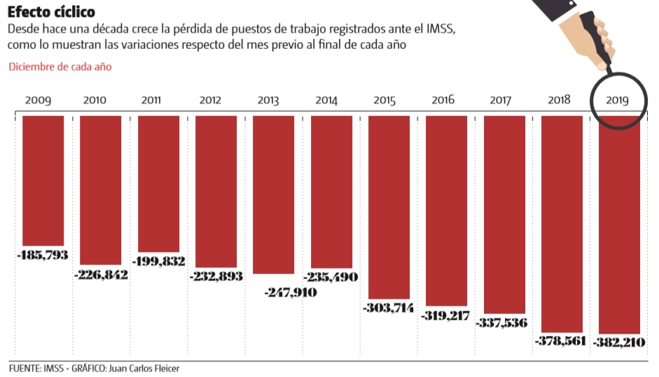 Cifras de empleo del IMSS de diciembre 2019 revelan que se dieron de baja a 388 mil 091 trabajadores en 30 entidades federativas, concentrándose la mayor cantidad en: Ciudad de México con una disminución de 70 mil 765; Nuevo León eliminó 38 mil 916 plazas, y el Estado de México 37 mil 438.