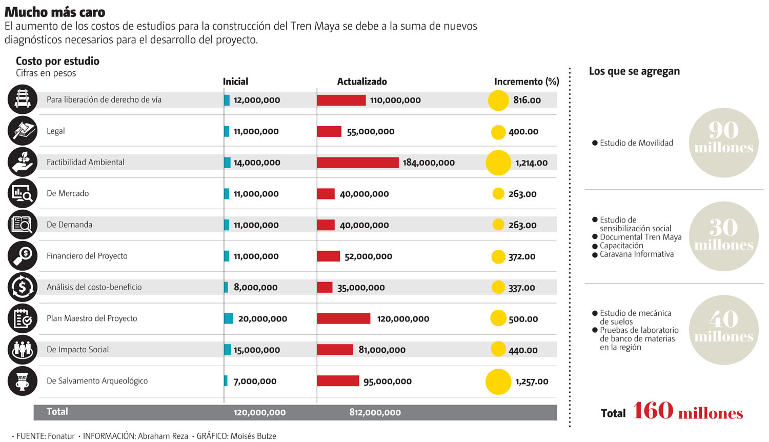 Los costos por estudios de preinversión para la construcción del Tren Maya —como el Plan Maestro y los de Factibilidad Ambiental— aumentaron 710 por ciento en cinco meses, al pasar de 120 millones de pesos a 972 millones, de acuerdo con las fichas técnicas del Proyecto General del Fondo Nacional de Fomento al Turismo (Fonatur).