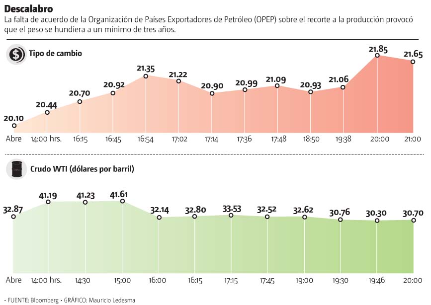 Debido a la falta de acuerdo en la Organización de Países Exportadores de Petróleo (OPEP) sobre el recorte a la producción y una estrategia de guerra de precios de Arabia Saudita, el peso sufrió una caída en su cotización frente al dólar; igual suerte sufrieron otras monedas y los mercados bursátiles de oriente.