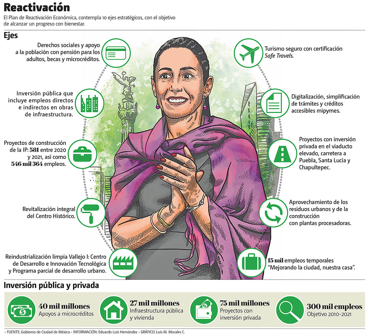 El gobierno capitalino presentó su plan de Reactivación Económica para el Bienestar de Ciudad de México que contempla una inversión pública y privada de 142 mil millones de pesos para impulsar obra pública, turismo, salud, movilidad, servicios urbanos, apoyos a la economía familiar y la creación de 300 mil empleos directos.