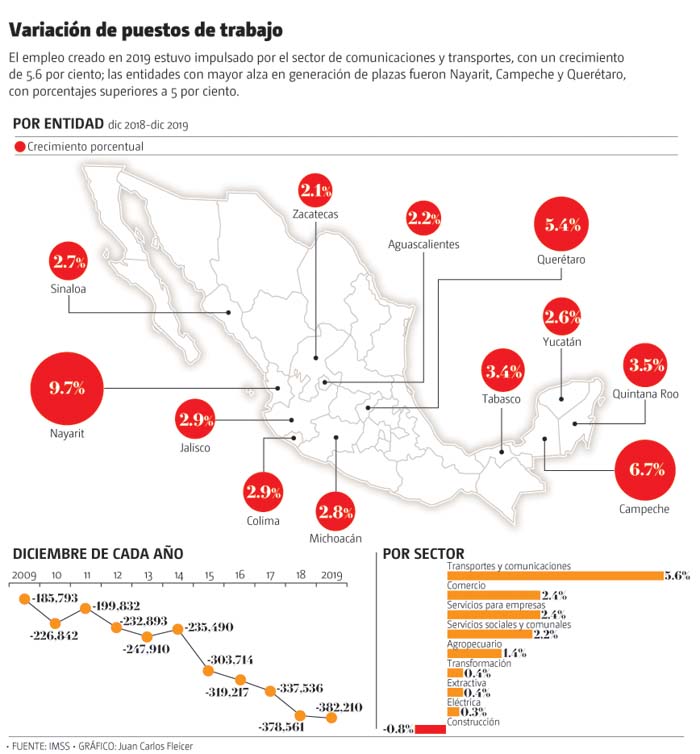 De acuerdo con la información proporcionada por el IMSS, en diciembre de 2019, como todos los cierres de año y debido a factores estacionales, se registró una caída de 382 mil 210 puestos de trabajo, 52 por ciento más que los 185 mil 793 perdidos en diciembre de 2009 y 1 por ciento más de los 378 mil 561 de 2018.
