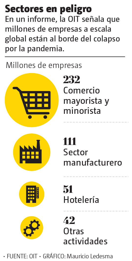 En su tercer informe sobre los efectos del covid-19 en el mercado laboral, la OIT calculó que 232 millones de empresas de comercio mayorista y minorista, 111 millones del sector manufacturero, 51 millones en la hostelería y 42 millones en otras actividades, como la inmobiliaria, están en peligro.