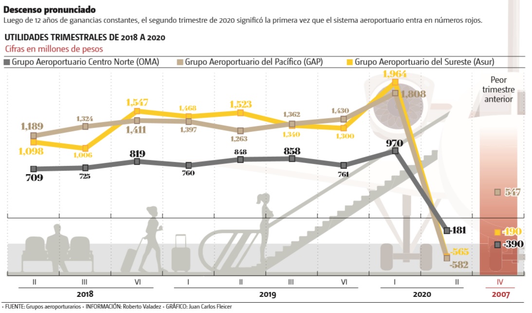 Esta atmósfera de ganancias consecutivas tuvo un freno en el segundo trimestre de 2020, cuando GAP, ASUR y OMA mostraron su primera pérdida neta en 12 años, después de la última, que fue en el cuarto trimestre de 2007.