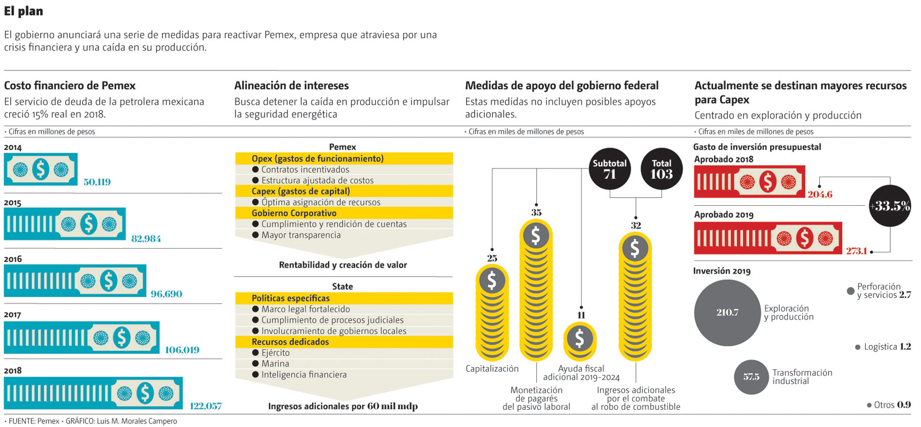 En una presentación a la que tuvo acceso MILENIO, Pemex detalló que entre las medidas que aplicará el gobierno destaca la capitalización por 25 mil millones de pesos, contemplada en el Presupuesto de Egresos de la Federación, y 35 mil millones de pesos para la monetización de pagarés del pasivo a pensiones.