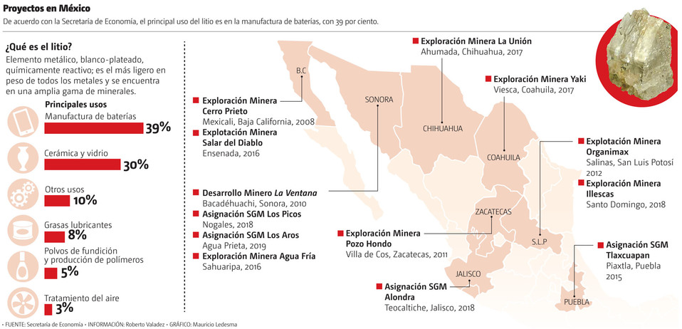 Información de la Secretaría de Economía señala que el principal uso del litio es la manufactura de baterías, con 39 por ciento; cerámica y vidrio, 30, y grasas lubricantes 8 por ciento.