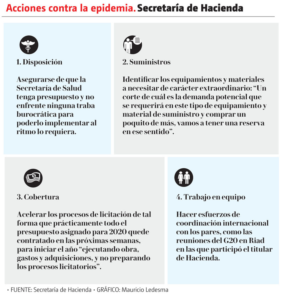En tanto, el titular de Hacienda, Arturo Herrera, anunció cuatro acciones para reducir el potencial impacto económico que pudiera generar la epidemia: la primera será asegurarse de que la Secretaría de Salud disponga de los recursos necesarios y no enfrente ninguna traba burocrática para contar con el presupuesto que demandará la atención del coronavirus.
