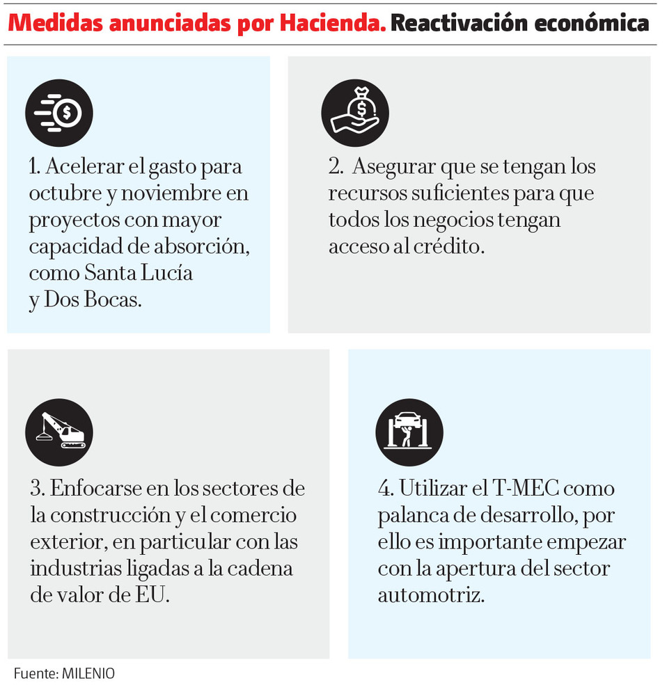 “Estamos acelerando el gasto que teníamos programado para los meses de octubre y noviembre, a fin de que impacte a la economía ahora y lo estamos acelerando en proyectos que tienen una mayor capacidad de absorción, para que el gasto se traduzca de manera más rápida en empleos, como el aeropuerto de Santa Lucía, la refinería de Dos Bocas”.