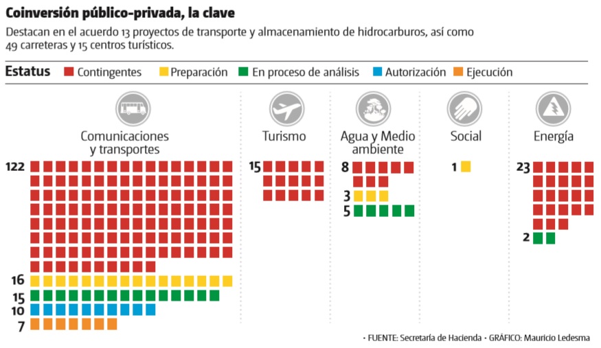 Del total de proyectos algunos contemplan inversión privada, como es el caso de una “minirrefinería en Nuevo León” con un monto de inversión de 2 mil 860 mdp; gasoducto Oaxaca-Chiapas con 14 mil 300 millones; gasoducto Chiapas, por 7 mil 700 millones, y el corredor interoceánico del Istmo de Tehuantepec con inversión de 154 mil mdp.