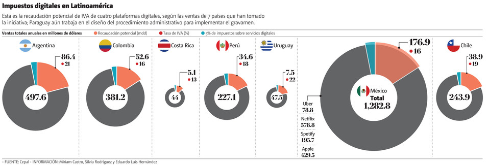 En el caso de México, el organismo estima que las ventas de Uber, Netflix, Spotify y Apple ascienden a cerca de mil 283 millones de dólares al año, cifra que de ser gravada con 16 por ciento de IVA y 3.0 por ciento por impuesto sobre los servicios digitales permitirían al erario recaudar cerca de 179 millones de dólares anuales.