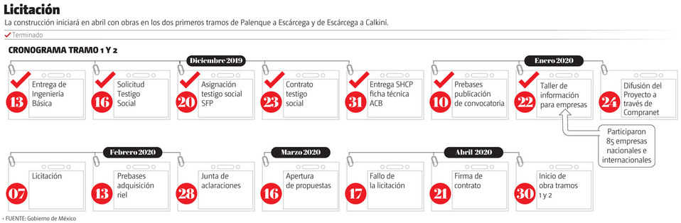 De acuerdo con el calendario, para el tramo uno, Palenque-Escárcega, el 10 de enero se publicaron las prebases de la licitación, mientras que la convocatoria abierta saldrá el próximo 7 febrero; el 17 de abril se anunciará quién la obtuvo, para que el 30 abril inicie la construcción.